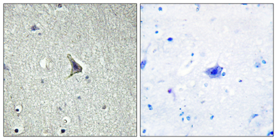 Immunohistochemistry analysis of paraffin-embedded human brain tissue, using GPR137C Antibody. The picture on the right is blocked with the synthesized peptide.