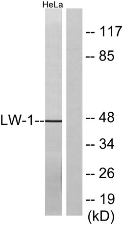 Western blot analysis of lysates from HeLa cells, using LW-1 Antibody. The lane on the right is blocked with the synthesized peptide.