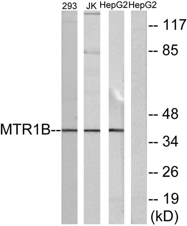 The antiserum was produced against synthesized peptide derived from human MTR1B. AA range:301-350
