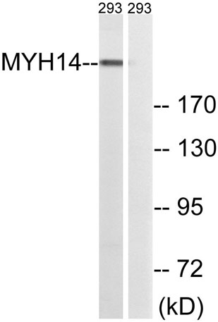 The antiserum was produced against synthesized peptide derived from human MYH14. AA range:1051-1100