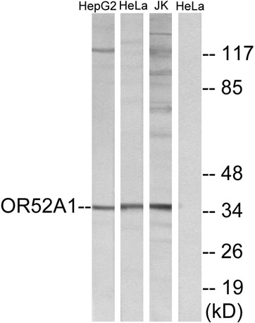 The antiserum was produced against synthesized peptide derived from human OR52A1. AA range:20-69