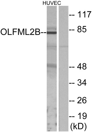 Western blot analysis of lysates from HUVEC cells, using OLFML2B Antibody. The lane on the right is blocked with the synthesized peptide.