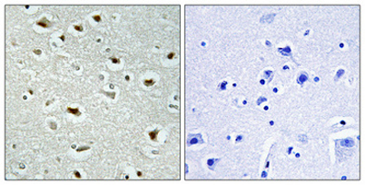 Immunohistochemical analysis of paraffin-embedded Human brain. Antibody was diluted at 1:100(4° overnight). High-pressure and temperature Tris-EDTA,pH8.0 was used for antigen retrieval. Negetive contrl (right) obtaned from antibody was pre-absorbed by i