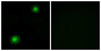 Immunofluorescence analysis of A549 cells, using ZNF187 Antibody. The picture on the right is blocked with the synthesized peptide.
