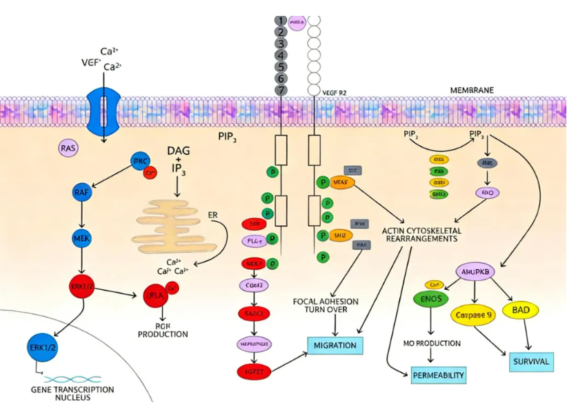 VEGF的信号通路涉及复杂的分级调控。VEGF与VEGFR-2结合后,激活PI3K/Akt和MAPK通路,进而调节细胞存活和增殖。同时,VEGF还能招募周细胞和炎症细胞,完善血管结构。值得注意的是,VEGF存在多种剪接变体(如VEGF121、VEGF165和VEGF189),这些变体在生物活性和组织分布上存在差异,而VEGF165是最常见的亚型,具有强效的促血管生成能力,而较长的变体则更易与细胞外基质结合,这种多样性增加了VEGF检测的复杂性,要求检测方法具备高特异性。